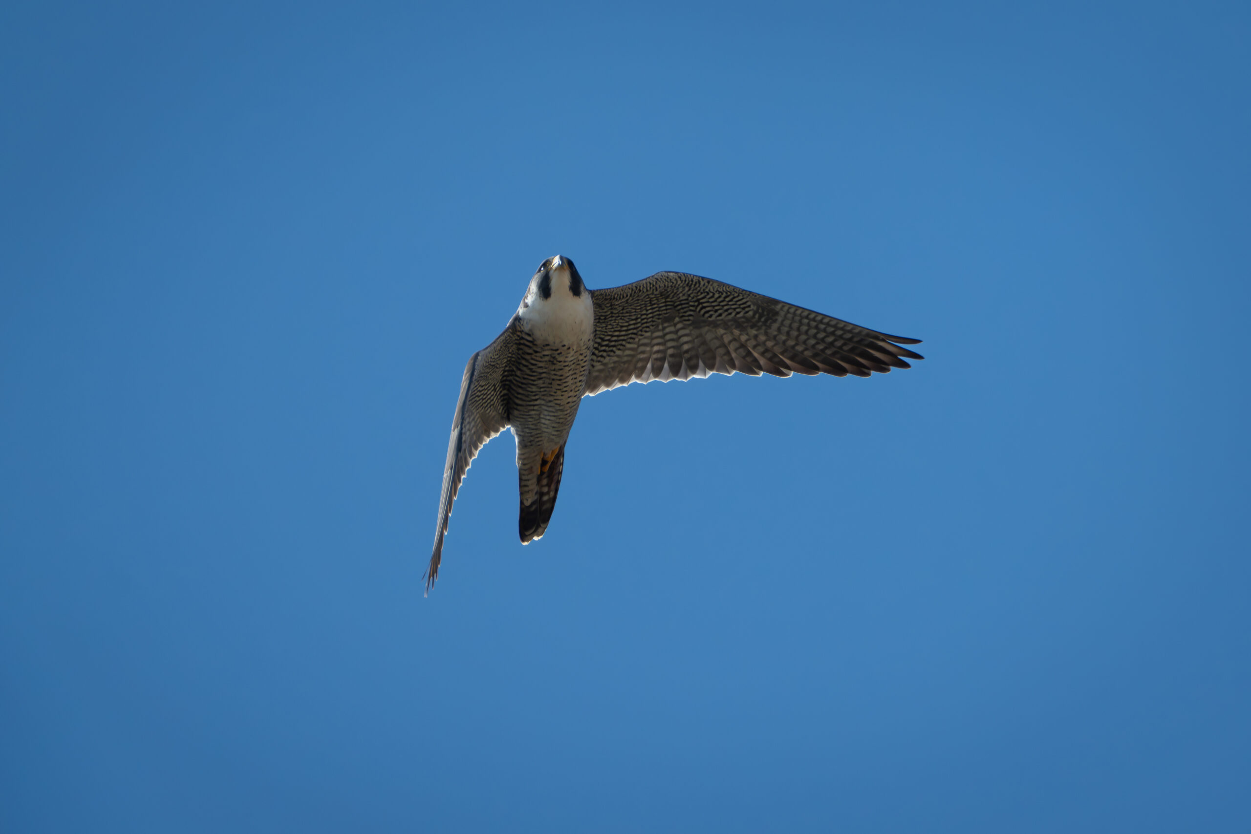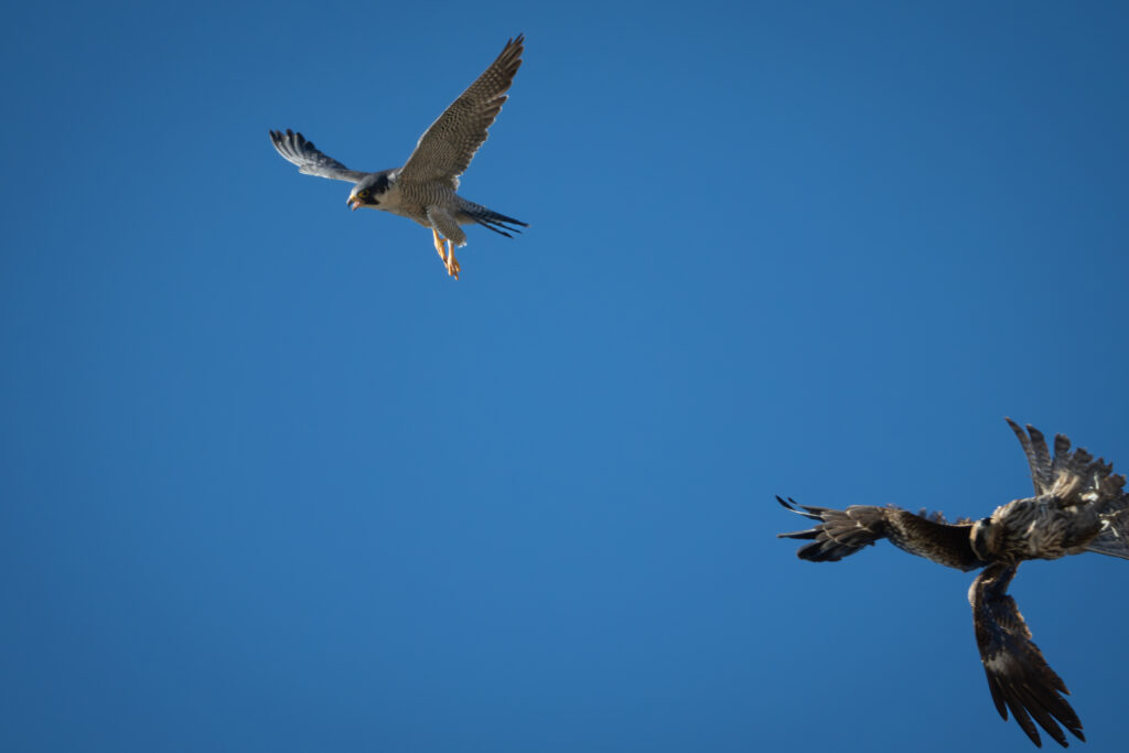 ハヤブサつがいが巣営する場所でのテリトリー侵入者への防衛行動を調べています。