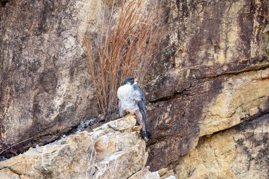 A Peregrine Falcon resting at a relatively close distance. (am10:29)